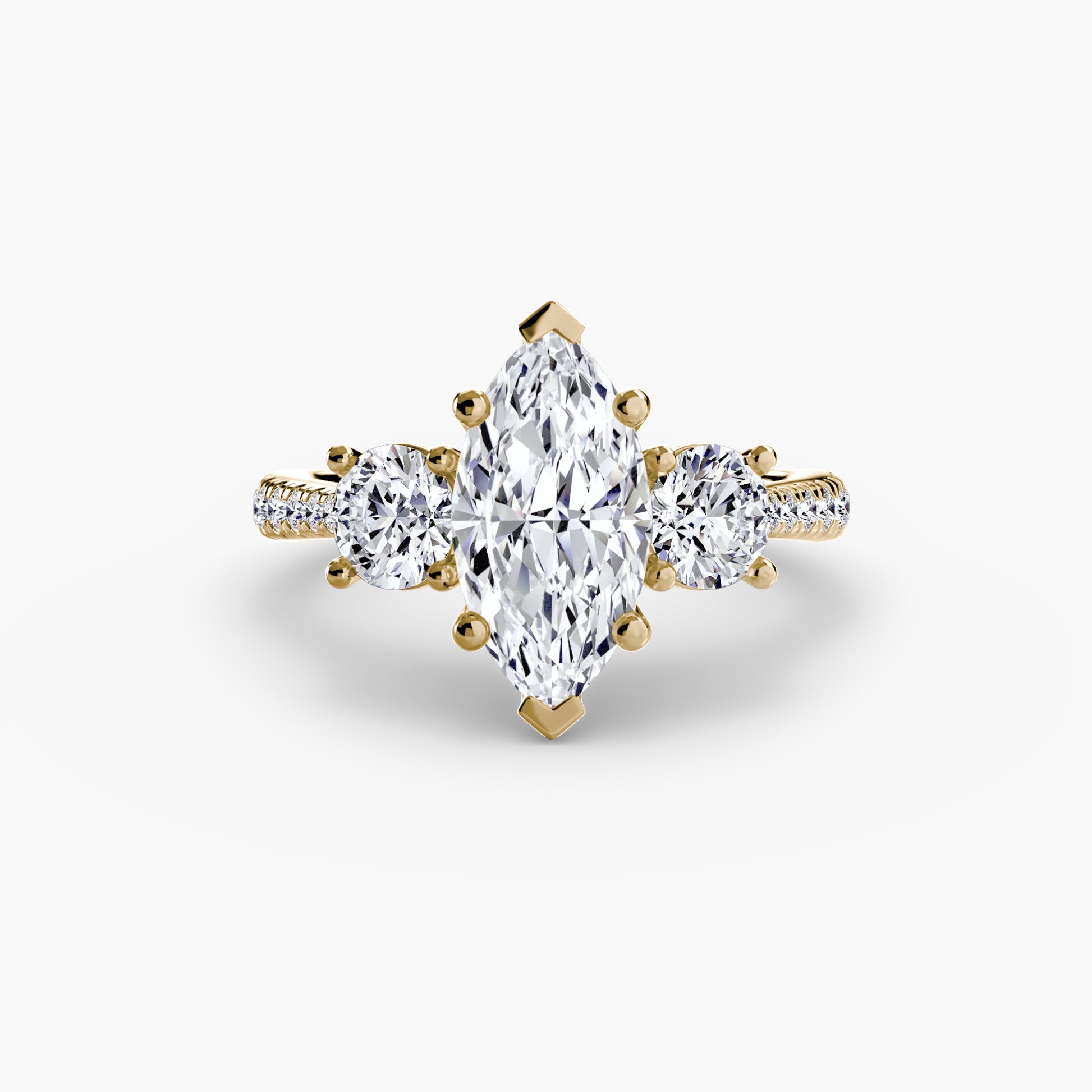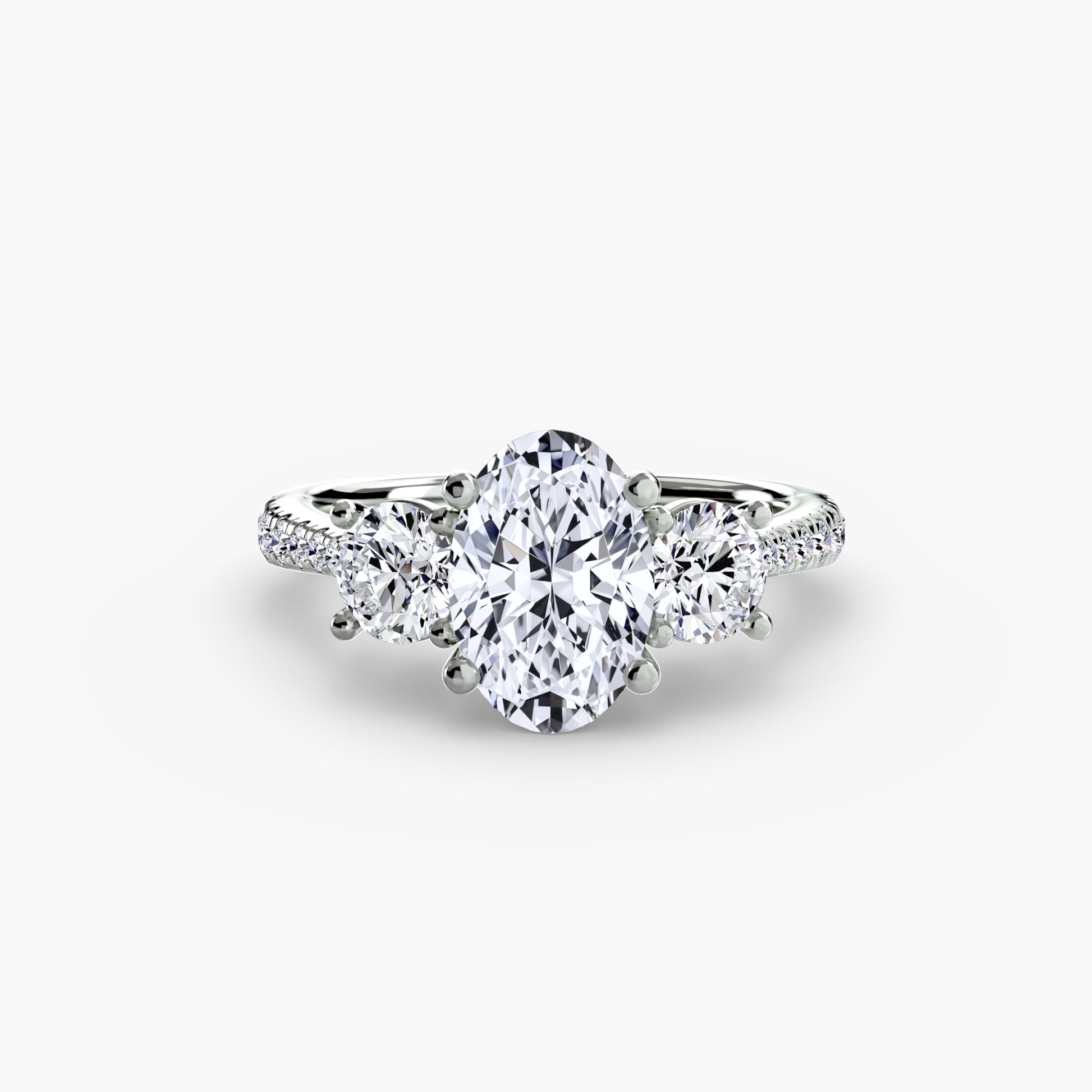 This elegant three-stone engagement ring represents your past, present, and future, beautifully enhanced by a refined pavé band for added sparkle and depth. A brilliant center diamond is flanked by two balanced side stones, creating a timeless silhouette with exceptional light performance.